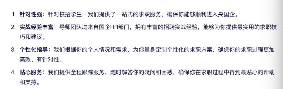 投递策略:结合 AI 岗位匹配系统与导师行业经验,筛选出与学员背景高度适配的央国企及关联系统岗位,制定 “精准投递 + 梯度备选” 的组合方案;