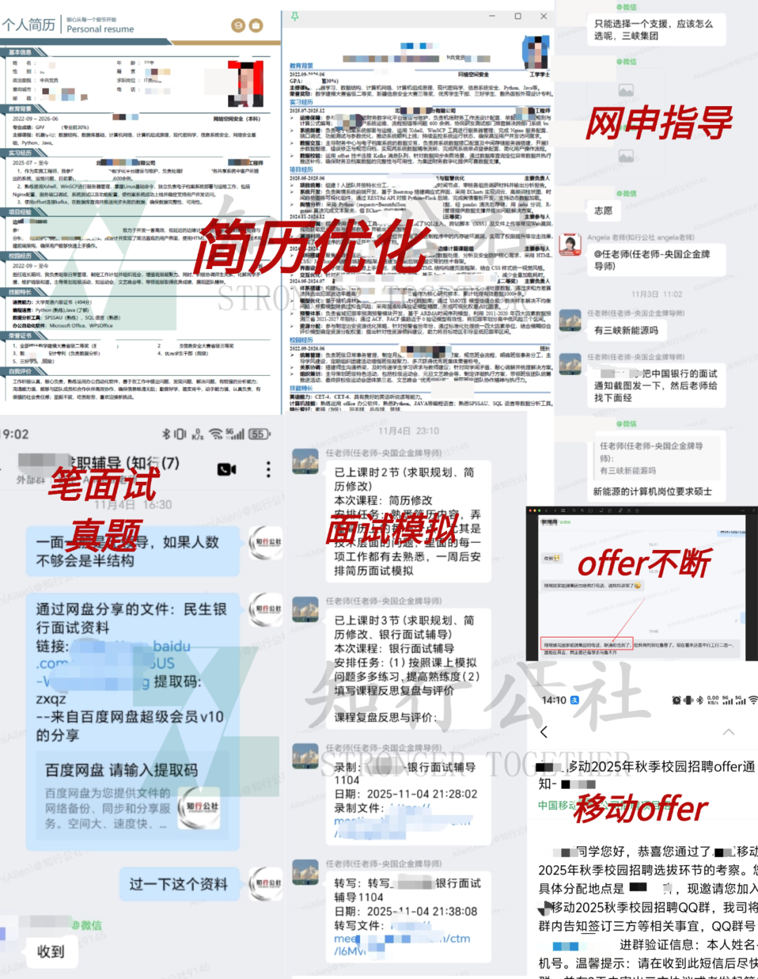 课时规划:紧扣学生需求,高效面试模拟。高效分配网申、笔试、面试各阶段辅导课时,确保秋招末期能拿到头部央国企offer。