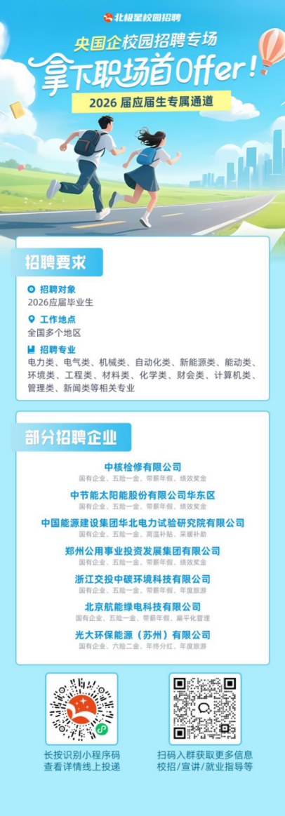 当青春的脚步遇见时代的召唤,当个人的理想融入国家的蓝图,你是否渴望在更广阔的舞台上书写人生华章?作为国家经济发展的中流砥柱,中央企业与国有企业始终秉持"国之大者"的使命担当,现面向全国高校广发"英雄帖"。在这里,你将参与国家重大战略工程,与行业领军者并肩前行;在这里,你将获得系统化培养体系,从职场新人成长为行业精英;在这里,你将享受具有市场竞争力的薪酬福利和多元化职业发展通道!