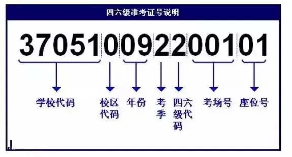 前5位是学校代码,第6位是学校的校区代码,第7-8位是考试年份。如2017年考试此处应为17,第9位是该年中第几次四六级考试,上半年是第1次,下半年是第2次,2017年6月考试就是1。