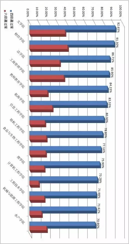2015届毕业生CET4的通过情况:文学院以92.65%排名第一,财经学院、法学院、工商管理学院分别以91.30%、86.71%、85.90%紧随其后。