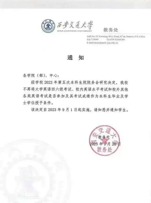 Xi'an Jiaotong University's Academic Affairs Office has announced that, as of Sept 1, 2023, they will no longer consider the scores or participation in exams such as CET-4, CET-6, school-level English tests, or external English proficiency exams as requirements for undergraduate student graduation and bachelor's degree conferral, following a decision made during the university's fifth undergraduate school affairs meeting in 2023.