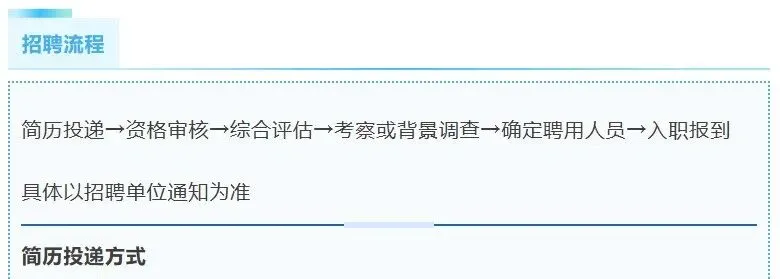 简历投递→资格审核→综合评估→考察或背景调查→确定聘用人员→入职报到。