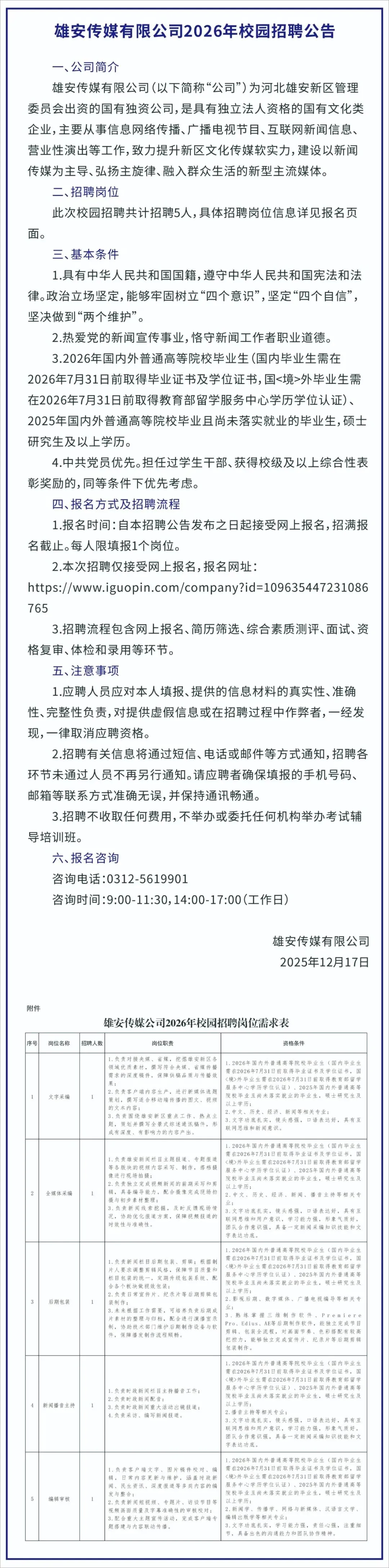 【职通央国企】雄安传媒2026年校园招聘正式启动,25-26届可投递,点击直达!