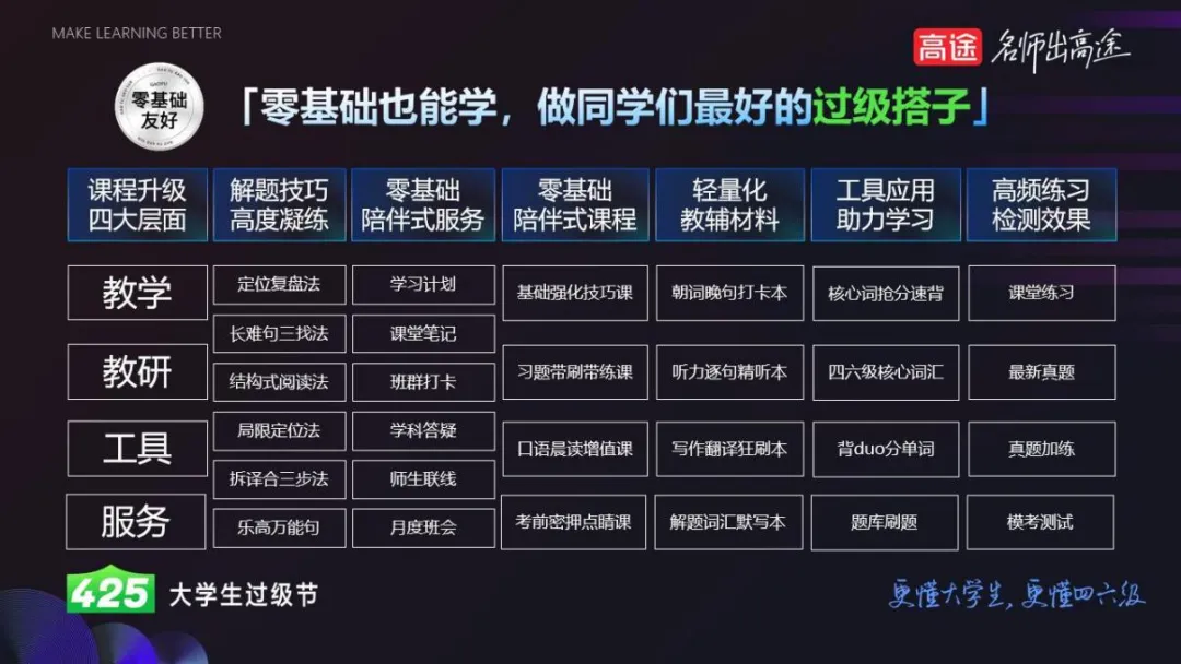 未来,高途教育科技集团与其四六级项目团队将继续在英语教学领域深耕,持续为国内英语学习者带来更多优质的教育资源和学习体验,开发符合大学生需求的优质课程,助力学生实现学业目标,达成人生理想。(推广)