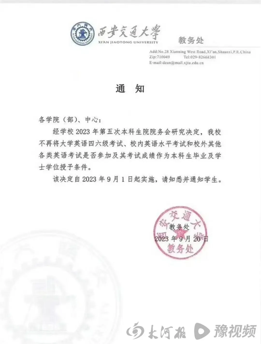 9月21日,网传西安交通大学教务处发布了一则关于取消英语四六级考试与学位证挂钩的通知。该通知写道:经学校2023年第五次本科生院院务会研究决定,学校不再将大学英语四六级考试、校内英语水平考试和校外其他各类英语考试是否参加及其考试成绩作为本科生毕业及学士学位授予条件。