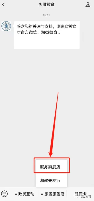 关注“湘微教育”,点击自定义菜单中的“服务旗舰店”。