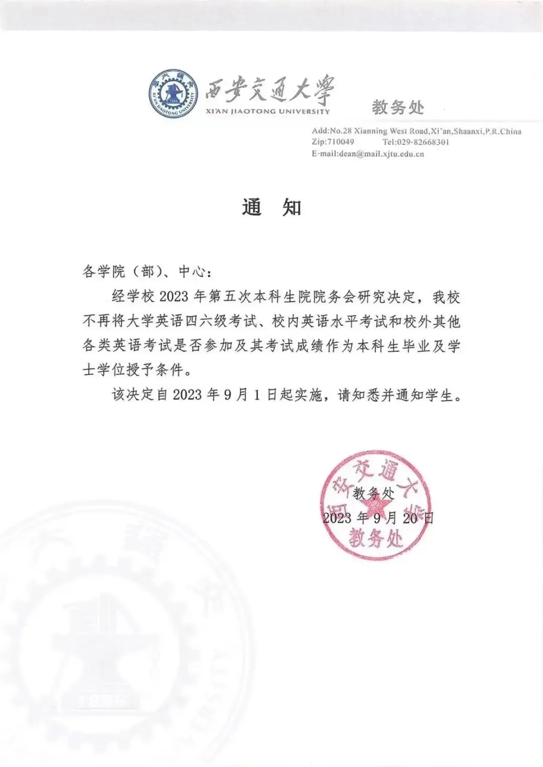 网传文件显示,西安交大教务处发文称,经学校2023年第五次本科生院务会研究决定,该校不再将大学英语四六级考试、校内英语水平考试和校外其他各类英语考试是否参加及其考试成绩,作为本科生毕业及学士学位授予条件。该决定自2023年9月1日起实施。