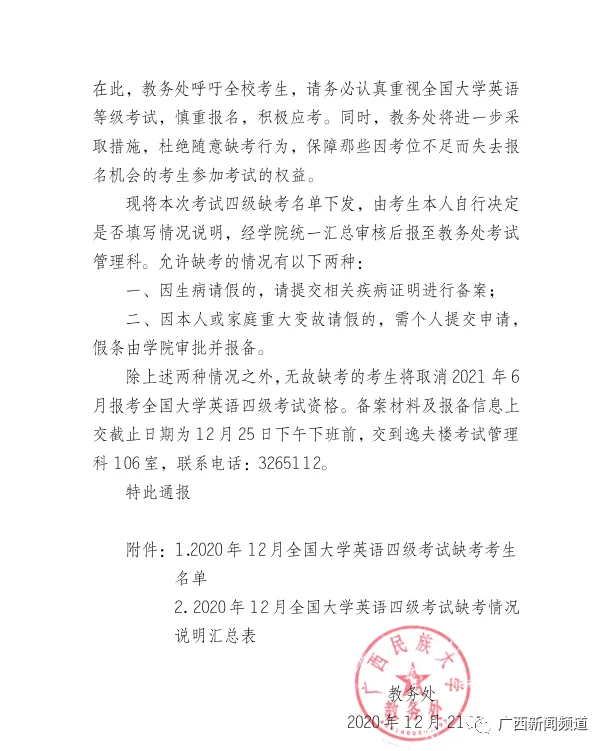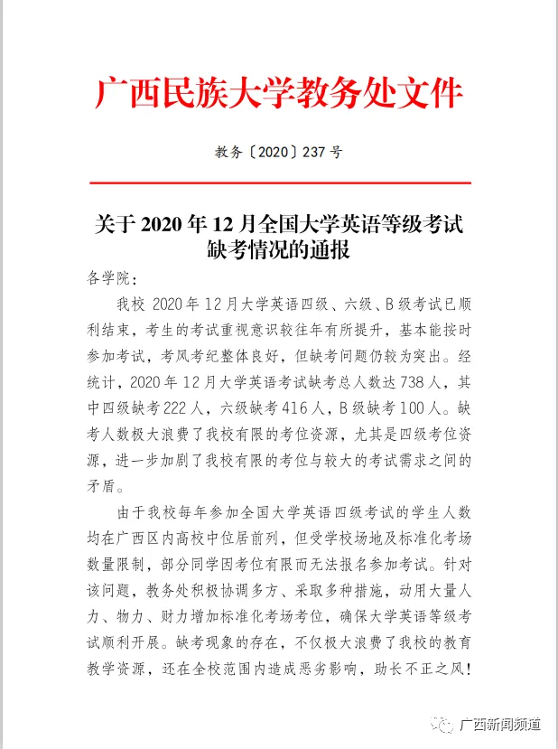 据广西民族大学网站12月21日消息,该校教务处当天发布《关于2020年12月全国大学英语等级考试缺考情况的通报》称,广西民族大学2020年12月大学英语四级、六级、B级考试已顺利结束,考生的考试重视意识较往年有所提升,基本能按时参加考试,考风考纪整体良好,但缺考问题仍较为突出。