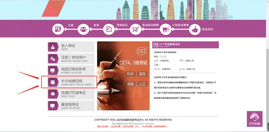 在首页点击补办成绩证明