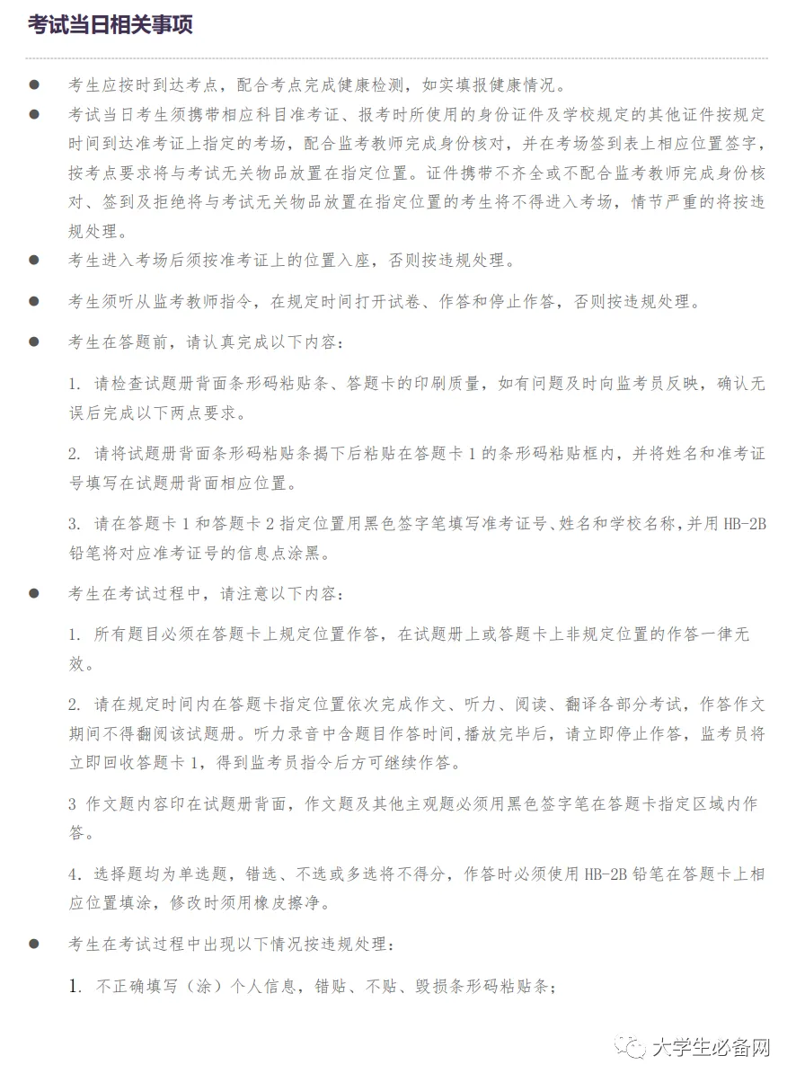 考试当日考生须携带相应科目准考证、报考时所使用的身份证件及学校规定的其他证件按规定时间到达准考证上指定的考场,配合监考教师完成身份核对,并在考场签到表上相应位置签字,按考点要求将与考试无关物品放置在指定位置。证件携带不齐全或不配合监考教师完成身份核对、签到及拒绝将与考试无关物品放置在指定位置的考生将不得进入考场,情节严重的将按违规处理。