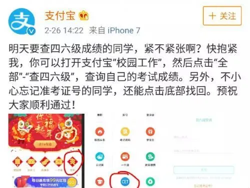 打开支付宝“校园工作”,然后点击“全部”-“查四六级”,查询自己的考试成绩。