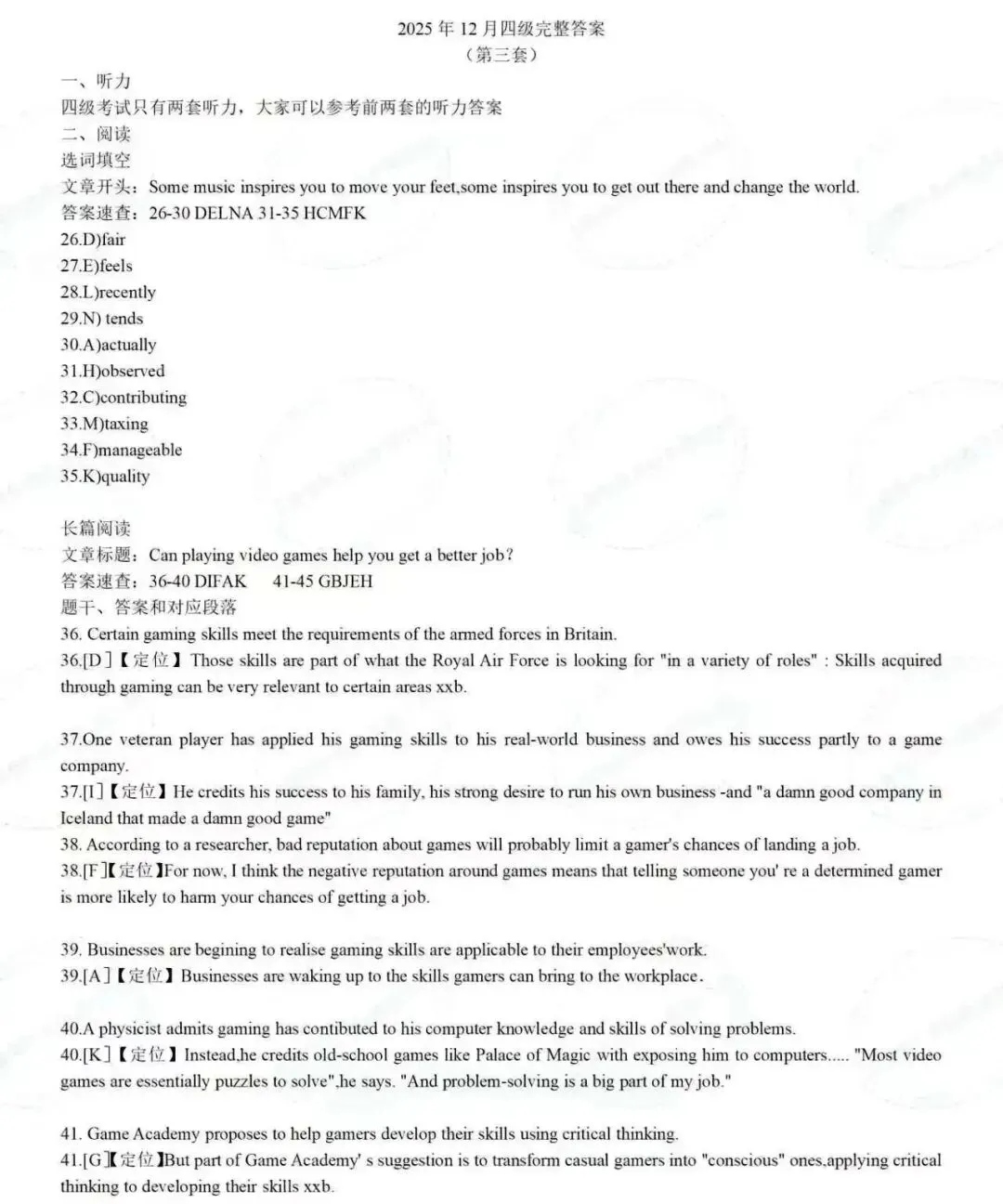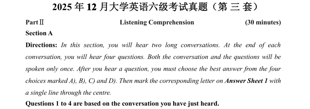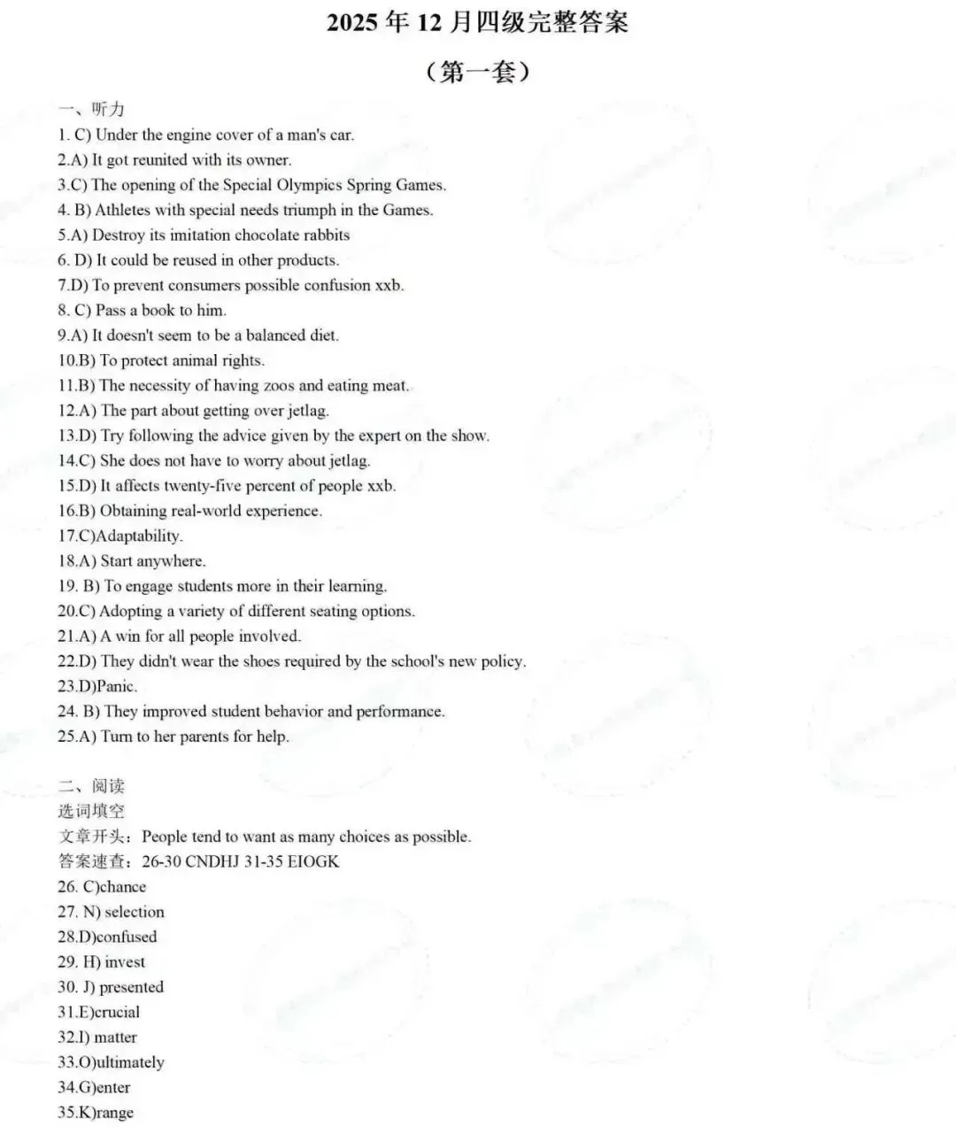 2025年12月英语四级真题试卷及答案解析(第一套)