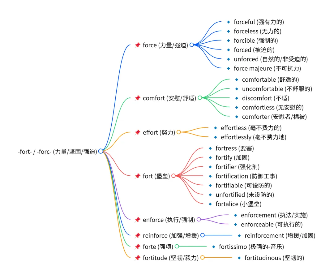 想象在一个坚固的fort(堡垒) 里,士兵们用force(武力) 抵抗敌人。指挥官为了reinforce(增援) 防线,命令fortify(加固) 城墙。虽然战斗很艰苦,但士兵们表现出了巨大的fortitude(坚韧)。战后,大家互相comfort(安慰),感谢彼此的effort(努力),并发现防守是他们的forte(强项)。