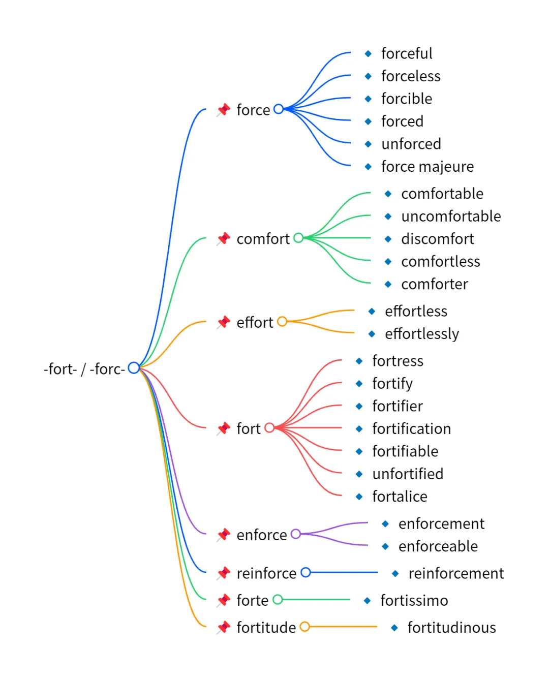 | 词源 | 源自拉丁语 fortis (strong, 强壮的) 和 forcere (to strengthen/press, 加强 / 压)。 |