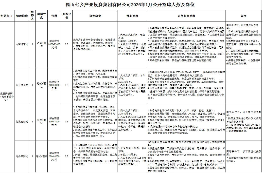 附件1:砚山七乡产业投资集团有限公司2026年1月公开招聘人数及岗位.xlsx