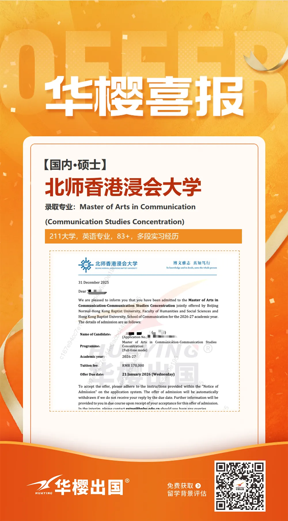 目前,华樱帮助不少双非学子圆梦北师港浸会大学,其中包含传播学硕士,互动媒体硕士等热门专业,扫码可查看详细录取案例+背景评估👇👇👇