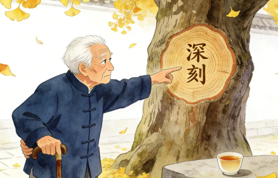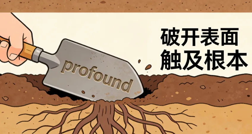 想象你问一位老人人生意义。他沉默良久,指着院里的老树说:“你看它的年轮。”——这种触及本质的回应,就是profound(深刻的)。谐音梗:“普罗芳的”(普罗大众都认可的芬芳智慧)→ “破入底的”(破开表面,深入底部)更贴合词根!