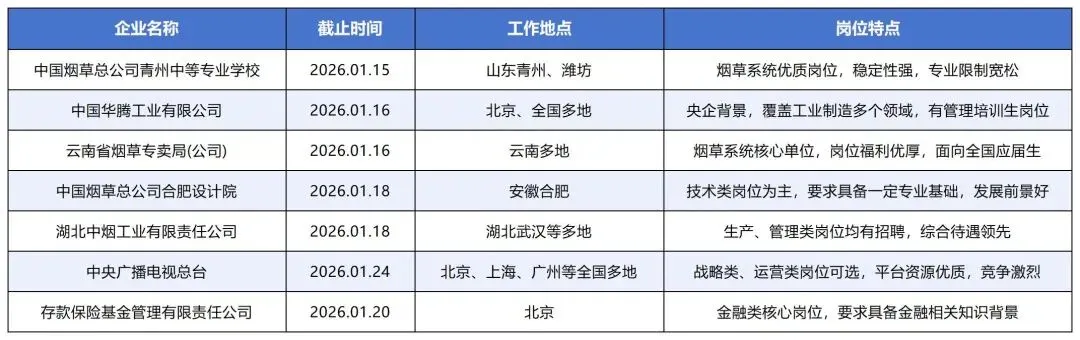 对于2026届应届生而言,秋招的硝烟尚未完全散去,春招已成为上岸央国企的“最后窗口期”。相较于秋招,央国企春招虽岗位数量略有缩减,但覆盖行业广、稳定性强的核心优势不变,尤其是能源、金融、通信等重点领域仍有大量优质岗位释放。本文整理了2026届央国企春招全行业时间表,搭配精准上岸攻略,帮你精准踩点、高效冲刺,牢牢抓住这最后的上岸机会!一、紧急预警:1月即将截止的春招提前批,别错过年前最后一波机会
