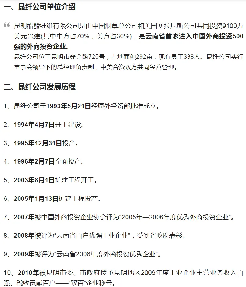 昆明醋酸纤维有限公司由中国烟草总公司和美国塞拉尼斯公司共同投资9100万美元兴建(其中中方占70%,美方占30%),为国家烟草专卖局(中国烟草总公司)直属单位,是云南省首家进入中国外商投资500强的外商投资企业。昆纤公司位于昆明市穿金路725号,占地面积292亩,现有员工338人。昆纤公司实行董事会领导下的总经理负责制,中美合资双方共同经营管理。