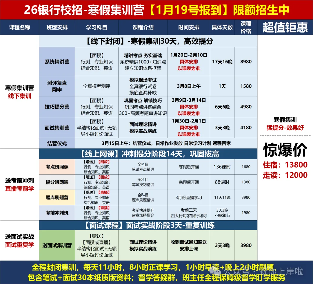 银行笔试的特点:考察的知识点比较多,范围比较广泛,考试题量大,所以备考需要结合自己的学习能力,一般需要2-3个月的备考时间,所以现在是开始备考的最佳时机,现在找工作难,报考银行的应届生比较多,为了成为考上的少数人,需要比大部分人多付出一些时间和精力,我们才能成为上岸的少数人。目前弘新教育的寒假班火爆预约中,集中线下学习,包酒店住宿,从报名汇总-选岗指导-简历修改-笔试培训-面试培训全流程服务,为你上岸保驾护航!