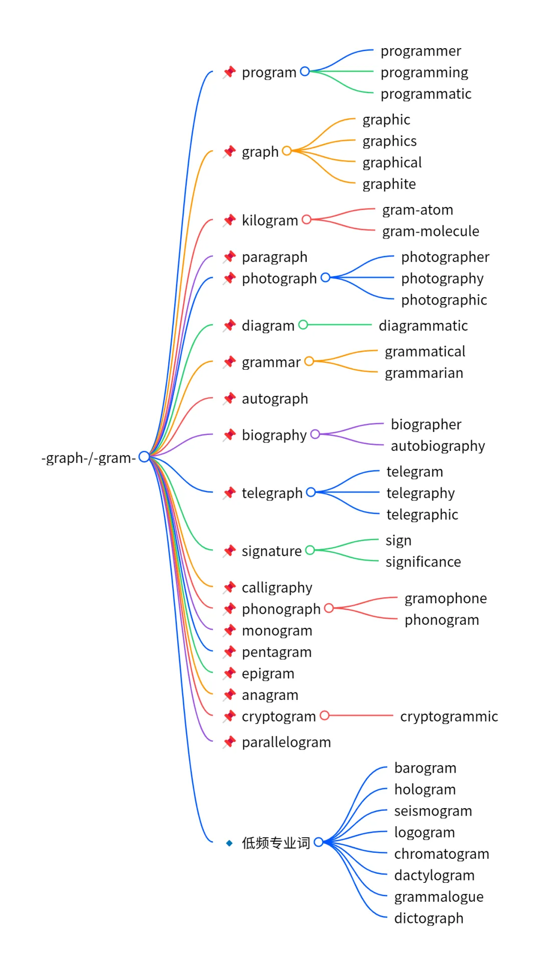 | 科学 / 专业领域 | diagram, biography, telegraph, telegram, barogram, hologram, seismogram, chromatogram, dactylogram |