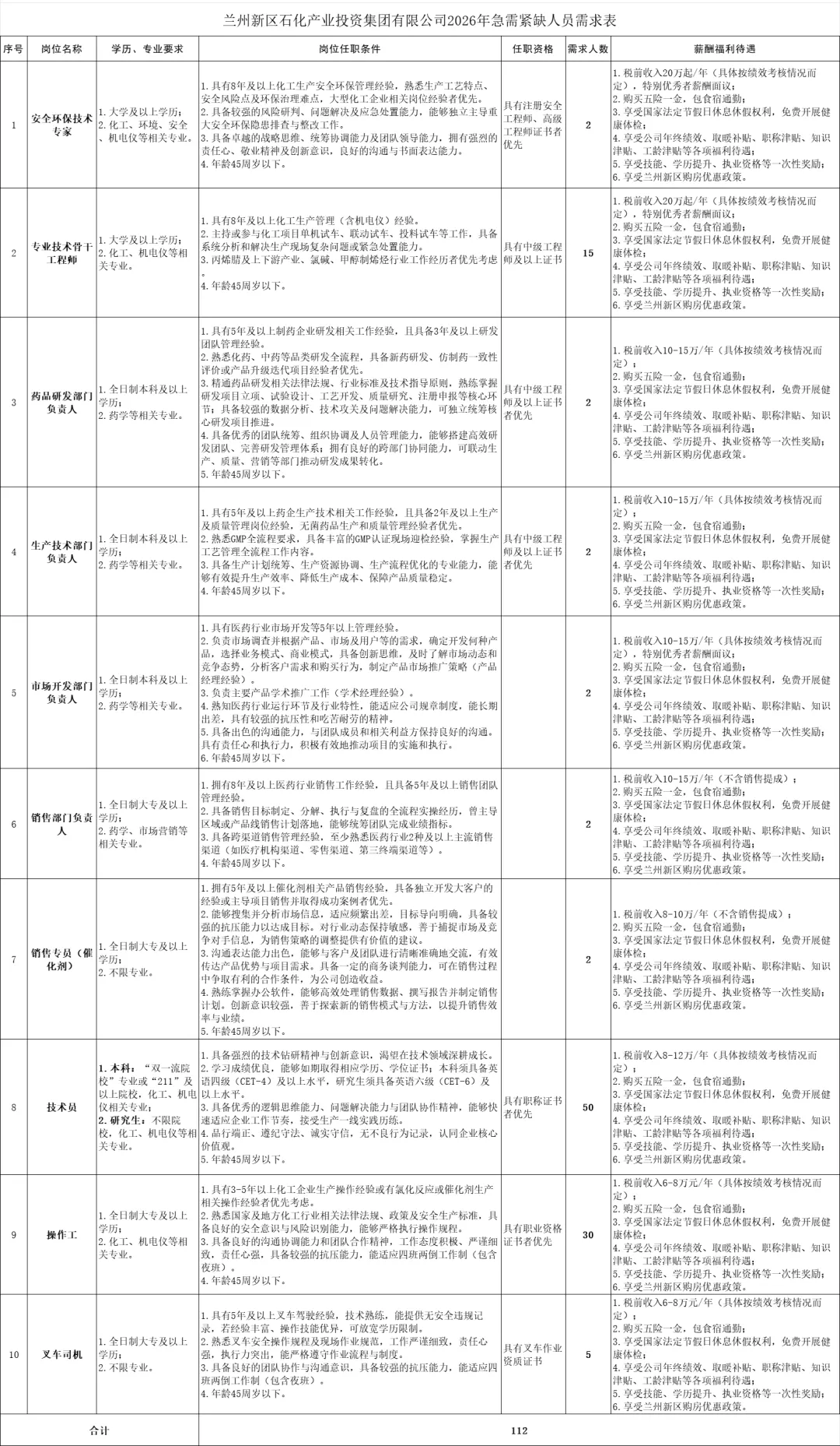 现因发展需要,面向社会公开引进安全环保技术专家、专业技术骨干工程师、药品研发部门负责人、生产技术部门负责人、市场开发部门负责人、销售部门负责人、销售专员(催化剂)、技术员、操作工、叉车司机共计112名,具体事宜公告如下: