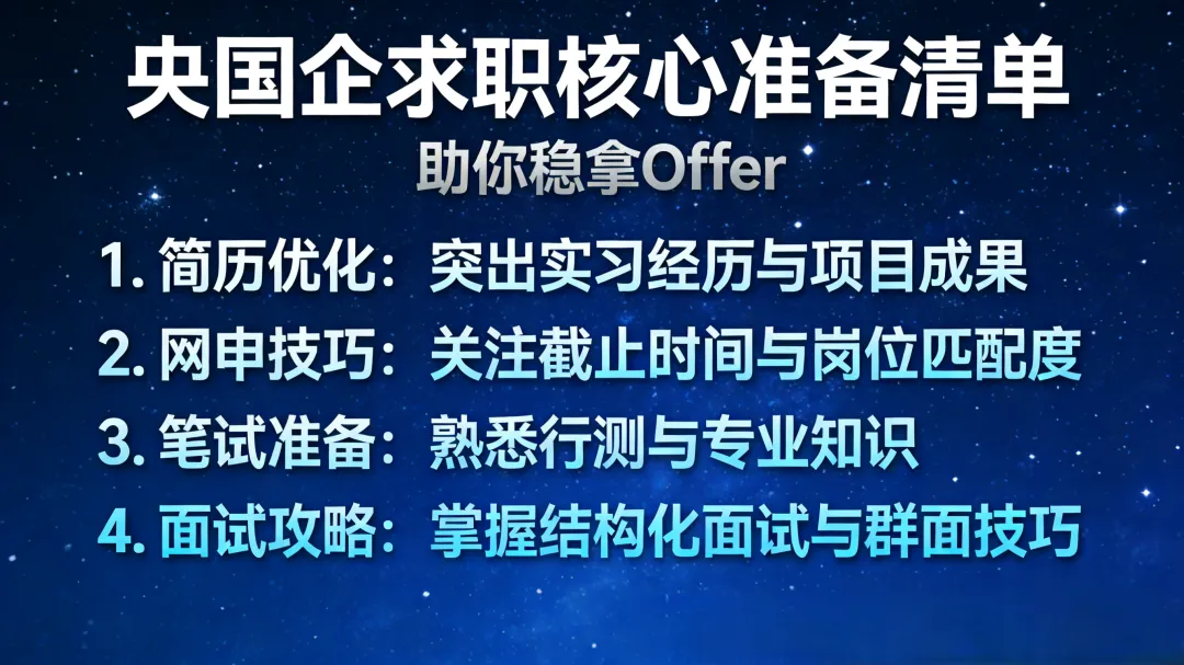 1.网申准备:提前梳理个人经历,按“STAR法则”优化简历,突出与岗位匹配的技能、经历;针对不同央国企调整简历侧重点(如能源央企侧重专业技术能力,文旅国企侧重综合服务能力);注意网申截止时间,避免因信息差错过报名,优先通过企业官网、官方公众号投递。