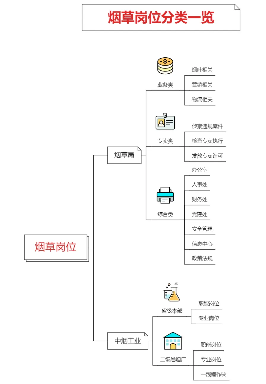 烟草专卖局(公司):专卖稽查员、客户经理、信息技术与档案管理员、法规与规范管理干事、烟叶技术员、科研员、专卖综合管理员、会计、文秘、物流信息管理员、区域中转站综合管理员、办公室综合管理员、群团干事、纪检监察干事、党务干事、安全管理员、勤管理员、市场分析员、用工与薪酬管理干事、配送员等