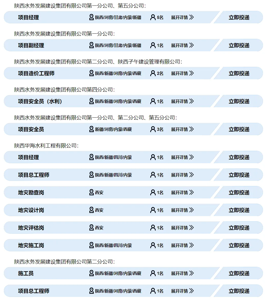 1.各岗位具体要求详见附件《陕西水务发展建设集团及所属子企业社会招聘需求表》;