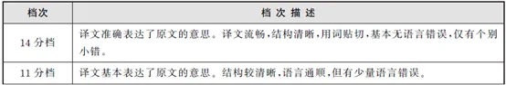 四级和六级的翻译均采用总体印象评分方式。翻译满分为15分,分为五个档次:14分档(13-15分)、11分档(10-12分)、8分档(7-9分)、5分档(4-6分)和2分档(1-3分)。四级和六级均采用相同的档次描述。每次阅卷时,参照档次描述分别确定当次考试四级和六级各档次的评分样卷。阅卷员经过培训后参照评分样卷对考生的翻译答卷进行评分。