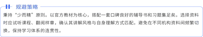 面对市场上琳琅满目的辅导资料,新考生往往“全盘接收”,教材、辅导书、模拟题堆积如山,却不知从何入手。资料过多反而分散精力,降低学习效率。