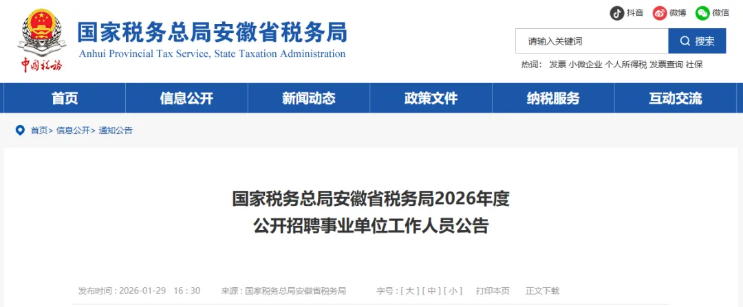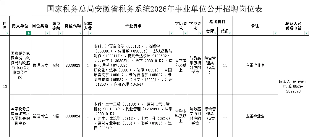 根据工作需要,国家税务总局安徽省税务局公开招聘事业单位工作人员42名,具体招聘岗位及要求见附表《国家税务总局安徽省税务系统2026年事业单位公开招聘岗位表》。招聘岗位所要求的专业名称,本科专业参照《普通高等学校本科专业目录(2025年版)》,研究生专业参照教育部《研究生教育学科专业目录(2022年)》、中国研究生招生信息网专业库。报考人员所学学科专业不在选定的参考目录中,但与岗位所要求的学科专业类同的,可以主动联系国家税务总局安徽省税务局确认报名资格。