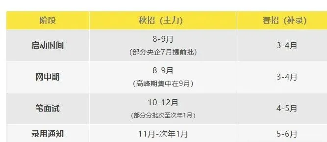 8月左右秋招开始,8-10月是网申投递高峰期,10月下旬-11月是笔面试高峰期。12月年底到来年2月也会有部分企业陆续招聘。