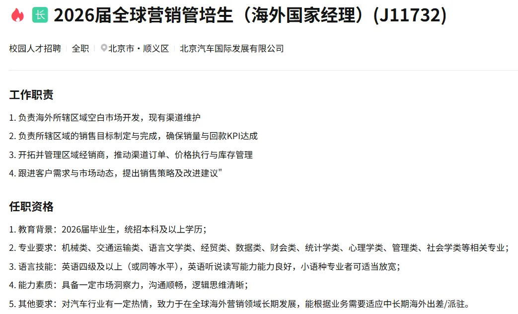 🏣北汽集团2026全球营销管培生(海外国家经理),综合薪资30w,职业发展路径清晰。