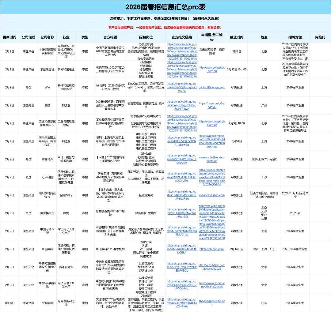 1:我们对接了大量的企业HR/高管/项目负责人/项目组成员/继任招募者,委托我们发布的实习/全职招聘信息都具有非常强的时效性!每日精选10条以上当日实习信息,会员专属!2:我们会定期整理汇总表,分时间:春招/秋招网申汇总表、寒暑假实习信息汇总表、远程实习信息汇总表等...分行业:国企央企汇总表/金融/咨询/互联网/事务所/快消岗位汇总表/国家部委招聘信息等等,每周第一时间分享到VIP会员群!部分展示示如下👇2025-2026年度会员将获得25个+招聘汇总表权益,每个表格将持续更新到周期结束覆盖行业全面:银行/证券/基金/保险/期货/互联网/电子商务/计算机软件/通信/国家机关/高校/研究所/事业单位 /教育/会计师事务所/咨询公司/法律/消费品/零售/服装/家具/贸易/制造业/汽车/电子/电器/机械/石油/钢铁/电力/能源/煤矿/化工/生物/制药/医疗/农林/畜牧/媒体/广告/旅游/公关/文化/影视/酒店.........个性化筛选:所有信息均支持自主筛选,行业-企业-截止时间-投递链接-工作地点…,分门别类,一目了然,既能海投,又能精准投递。每周校招截止提醒⏰:每周截止校招专属提醒,不错过任何一个机会!包括国央企、事业单位、民企、外企、合资企业......。