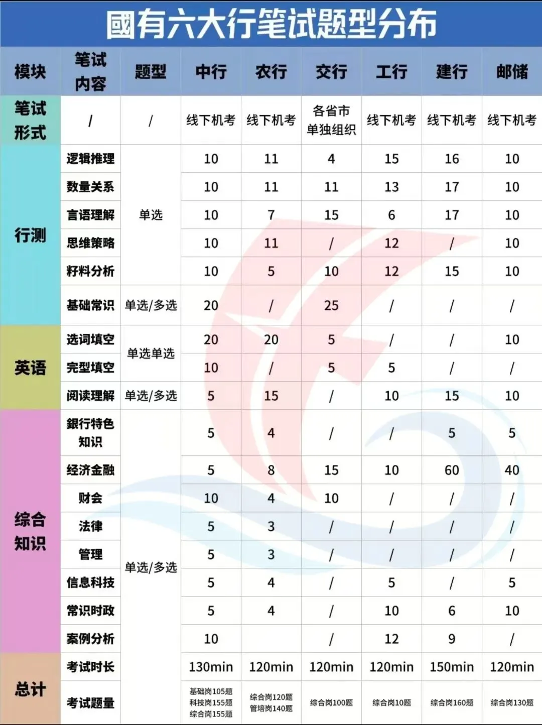 以六大银行为例,笔试基本以机考形式进行,笔试内容半数以上为《行测》同类题型,余下补充英语、行业时政、行业知识、岗位对应专业知识等内容,基本以选择题样式考察。