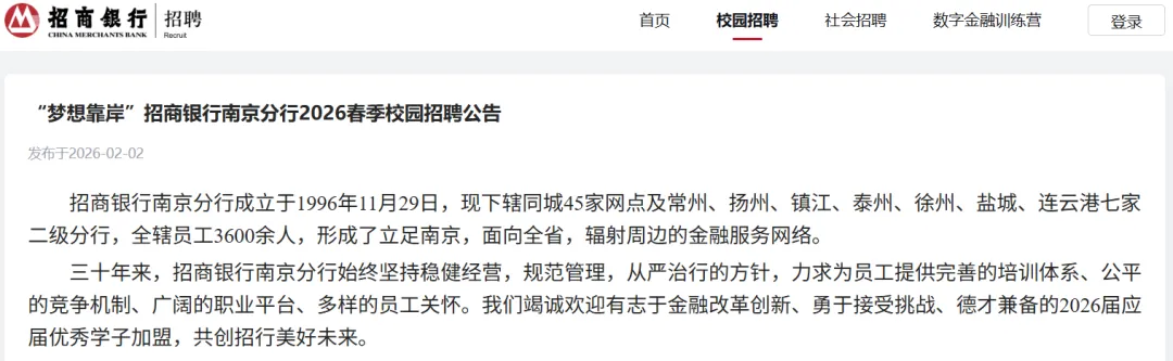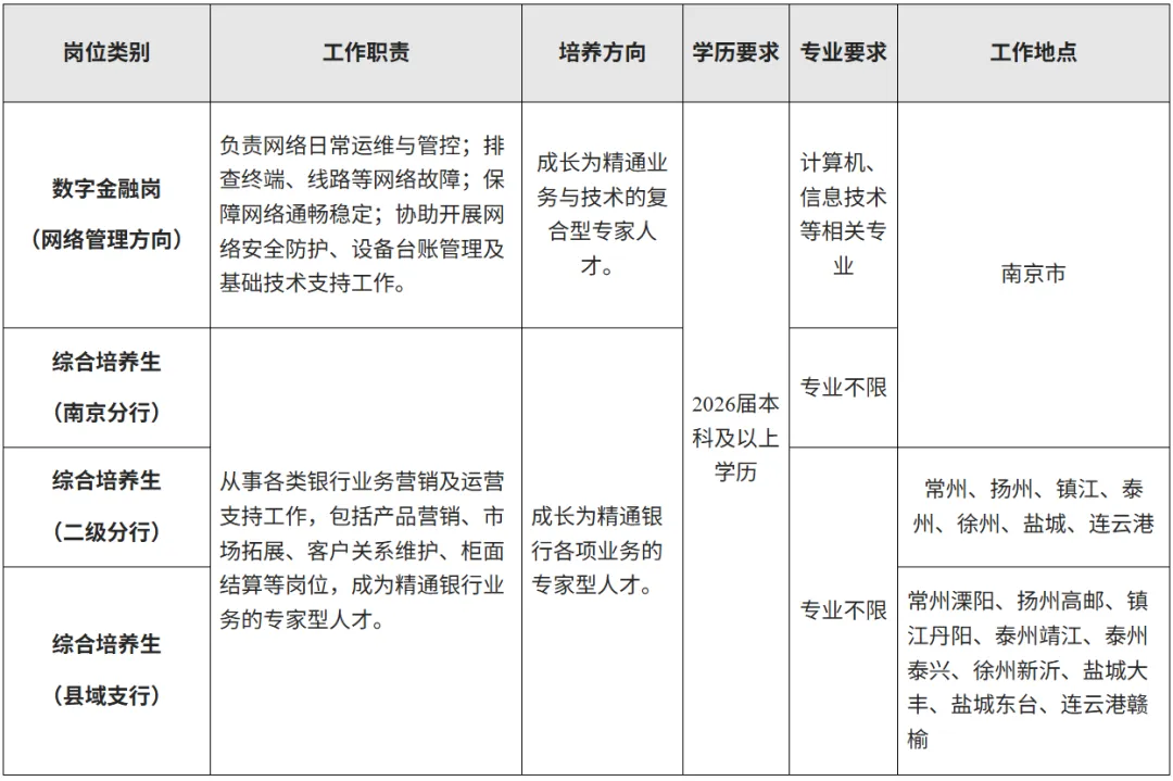 招商银行江苏地区春招公告已陆续发布,重点招录2026届应届毕业生,工作地点分布各市,职位类型较多,部分岗位不限制报考专业。