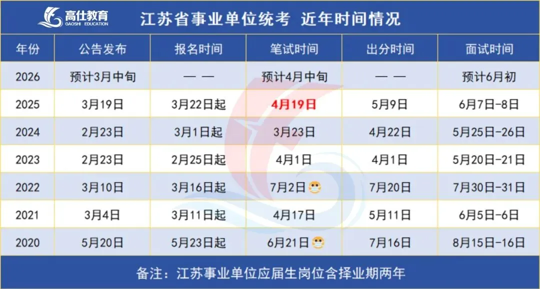 2026年度江苏事业单位统考笔试预计将于4月中旬进行,近年全省招录量皆为6000余人,笔试难度较低,且题型与银行笔试完全一致,建议春招考生同期准备,把握上岸机会。如成功上岸事业单位则可签订聘用合同,从事体制内相关工作,收入及稳定性都将更上一层楼,建议同期准备。