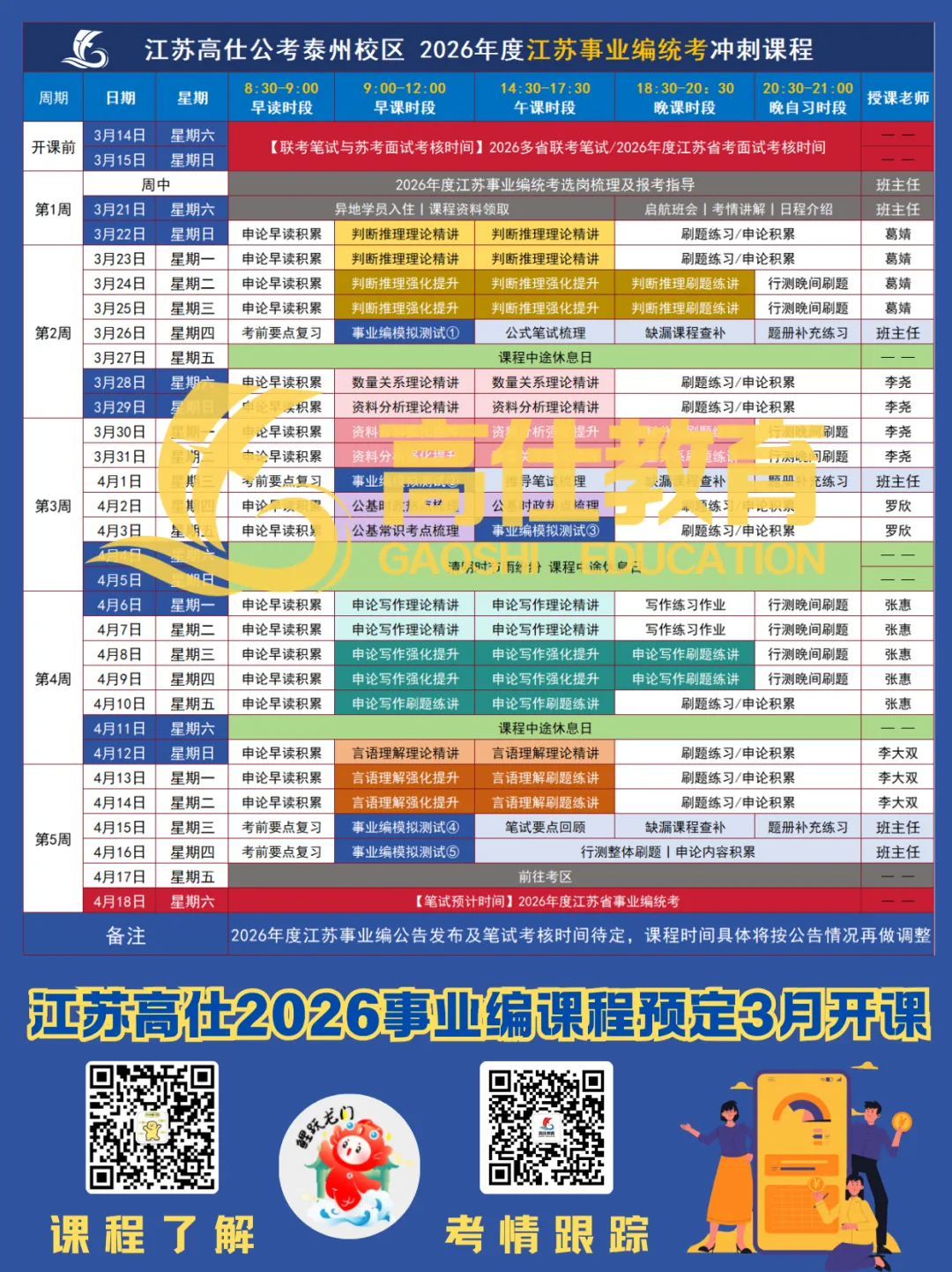 2026年江苏事业单位统考笔试课程,高仕公考苏中教学基地预计于3月中旬起开始授课,学至考前。岗位选报指导、分科深度精讲、行测申论强基、考前练讲冲刺、真题模考测评,助力学员切实提分,力争高分进面。