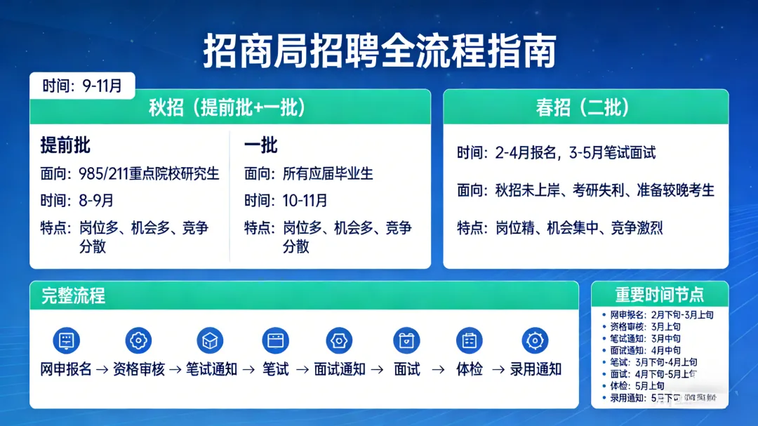 春招(二批):时间在2-4月报名,3-5月笔试面试;特点是岗位精、机会集中、竞争激烈;适合秋招未上岸、考研失利、准备较晚的考生