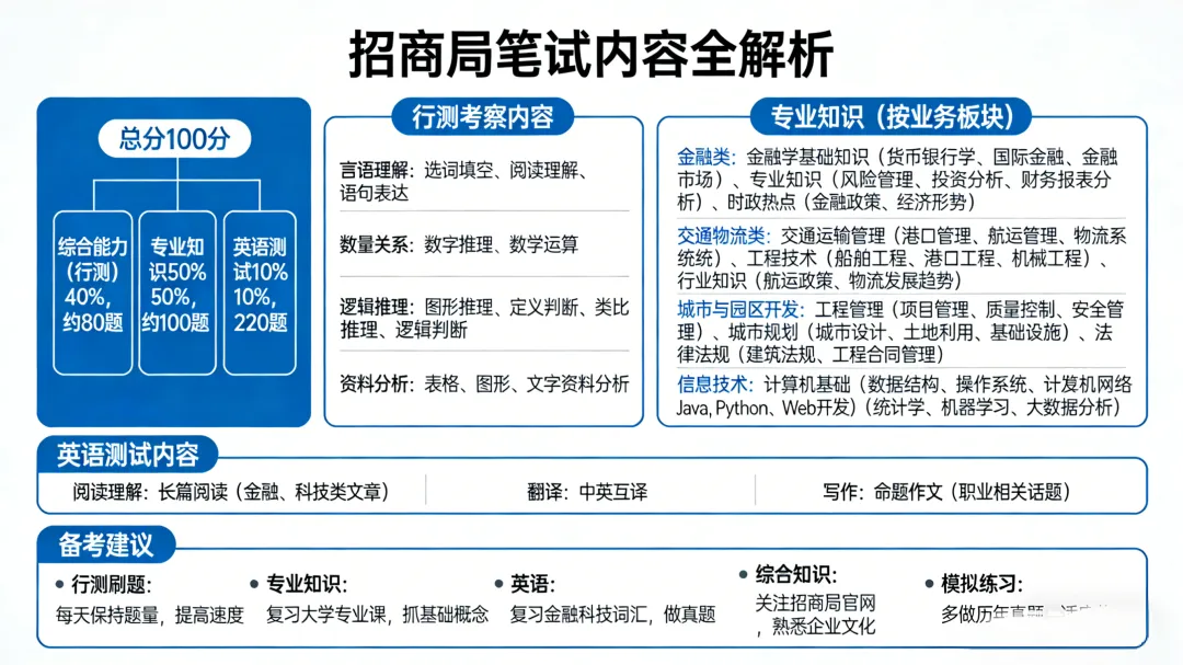 备考建议:行测刷题是王道,每天保持一定题量,提高做题速度;专业知识复习大学专业课,重点抓基础概念和核心原理;英语重点复习金融、科技类词汇,做真题练习;综合知识关注招商局官网,熟悉企业文化和价值观;模拟练习多做历年真题,适应考试节奏