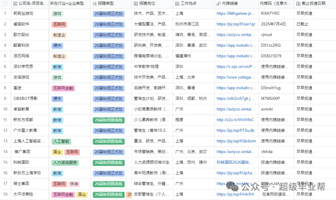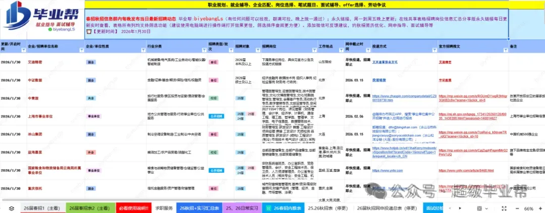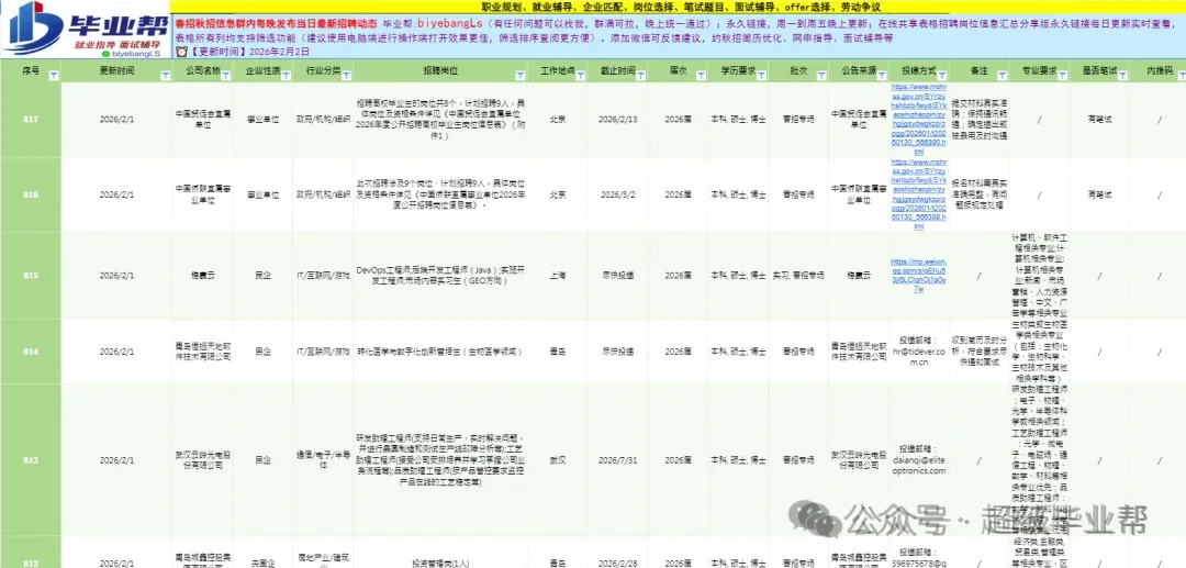 所有招聘信息是由专门负责搜集校招信息的几十名同仁共同分享并及时汇总,再加上咱们把市面上其它的付费表同时整合了起来,让我们的更新速度和全面性远超其它付费表格/付费群!