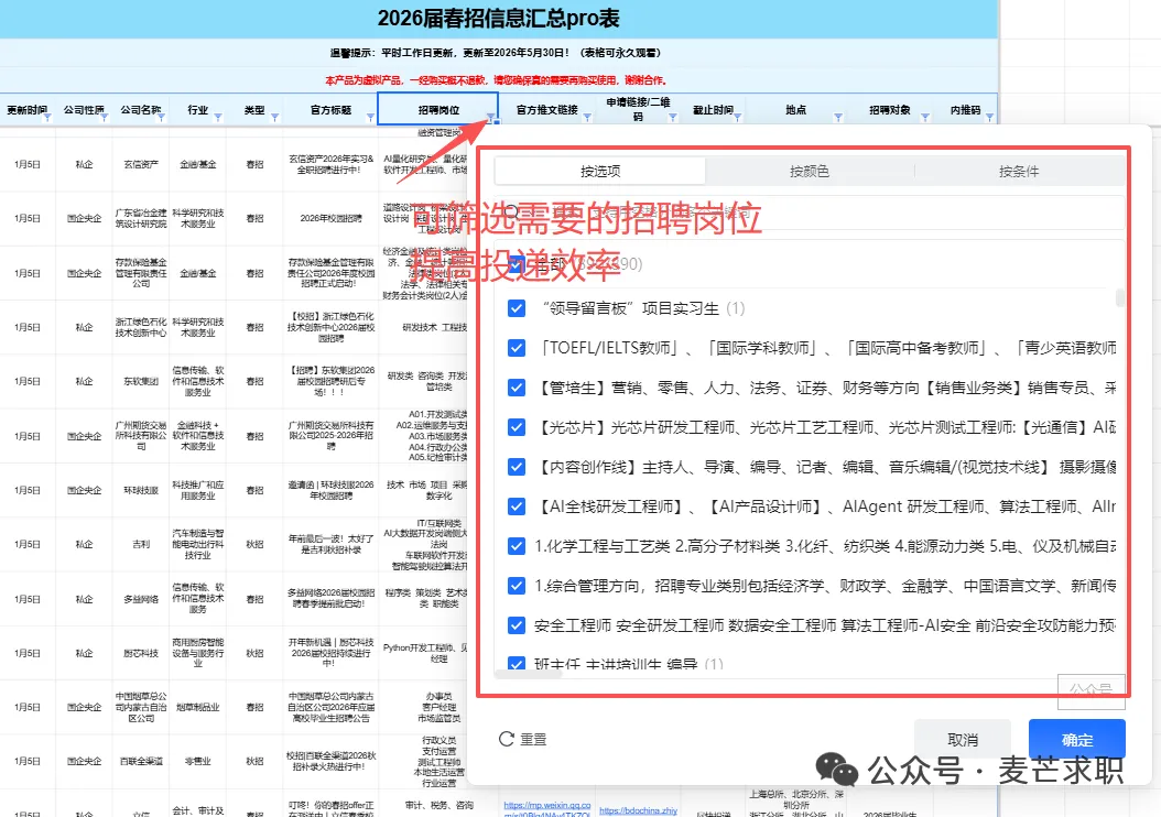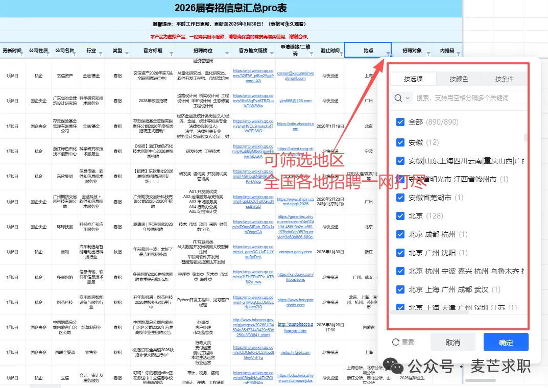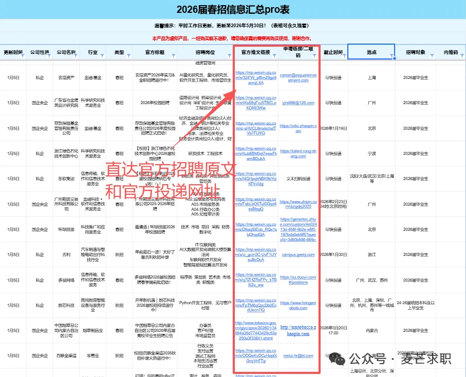 1:我们对接了大量的企业HR/高管/项目负责人/项目组成员/继任招募者,委托我们发布的实习/全职招聘信息都具有非常强的时效性!每日精选10条以上当日实习信息,会员专属!2:我们会定期整理汇总表,分时间:春招/秋招网申汇总表、寒暑假实习信息汇总表、远程实习信息汇总表等...分行业:国企央企汇总表/金融/咨询/互联网/事务所/快消岗位汇总表/国家部委招聘信息等等,每周第一时间分享到VIP会员群!部分展示示如下👇2025-2026年度会员将获得25个+招聘汇总表权益,每个表格将持续更新到周期结束覆盖行业全面:银行/证券/基金/保险/期货/互联网/电子商务/计算机软件/通信/国家机关/高校/研究所/事业单位 /教育/会计师事务所/咨询公司/法律/消费品/零售/服装/家具/贸易/制造业/汽车/电子/电器/机械/石油/钢铁/电力/能源/煤矿/化工/生物/制药/医疗/农林/畜牧/媒体/广告/旅游/公关/文化/影视/酒店.........个性化筛选:所有信息均支持自主筛选,行业-企业-截止时间-投递链接-工作地点…,分门别类,一目了然,既能海投,又能精准投递。每周校招截止提醒⏰:每周截止校招专属提醒,不错过任何一个机会!包括国央企、事业单位、民企、外企、合资企业......。