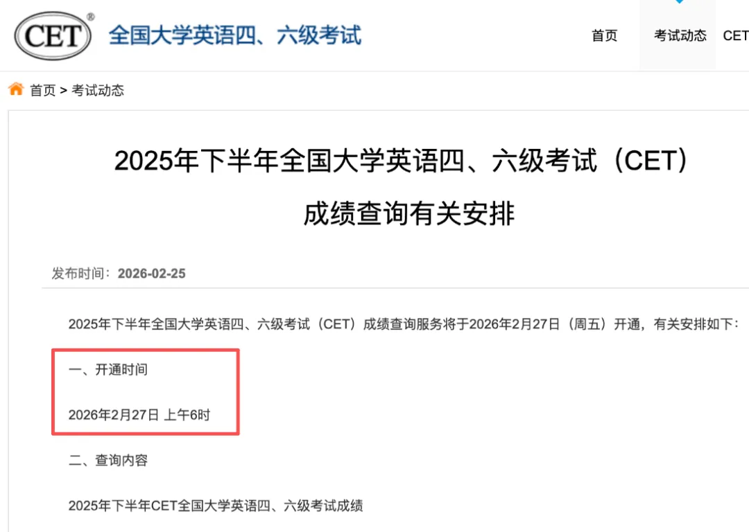 2025年下半年全国大学英语四、六级考试(CET)成绩查询服务将于2026年2月27日开通。