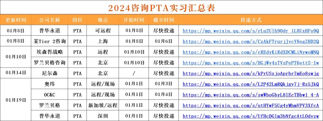 1:我们对接了大量的企业HR/高管/项目负责人/项目组成员/继任招募者,委托我们发布的实习/全职招聘信息都具有非常强的时效性!每日精选10条以上当日实习信息,会员专属!2:我们会定期整理汇总表,分时间:春招/秋招网申汇总表、寒暑假实习信息汇总表、远程实习信息汇总表等...分行业:国企央企汇总表/金融/咨询/互联网/事务所/快消岗位汇总表/国家部委招聘信息等等,每周第一时间分享到VIP会员群!部分展示如下👇3:整理求职资料,包括简历模板,行业知识、笔试真题、模拟题、面试资料、求职指南、技能自学攻略等等,都会第一时间分享给VIP会员。部分展示如下👇