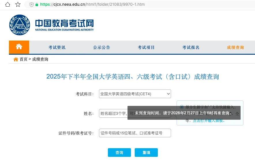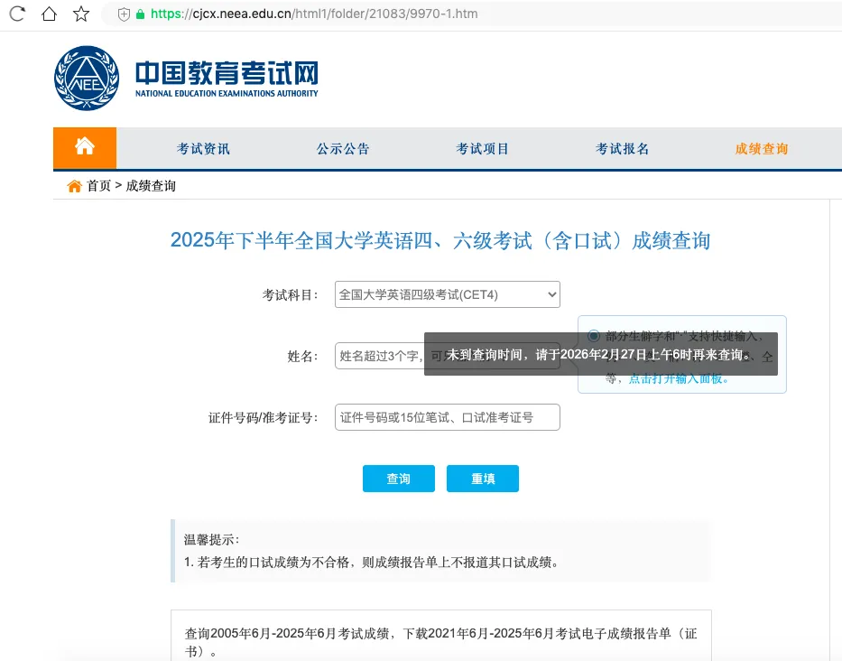 2026 年 2 月 25 日,中国教育考试网官方发布通知:2025 年 12 月全国大学英语四、六级考试(CET)成绩,定于2026 年 2 月 27 日(周五)上午 6:00准时开放查询。所有考生可免费查询笔试与口试成绩,无需付费、无需预约,认准官方渠道即可快速查分。