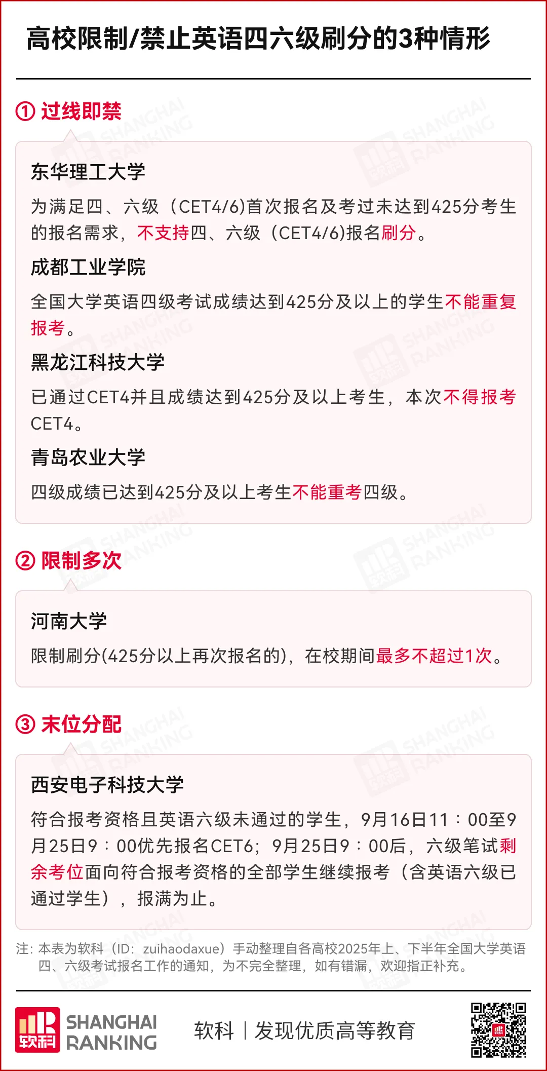 目前,多所高校明确限制、禁止四六级重复报考刷分,大致可分为以下3种情形: