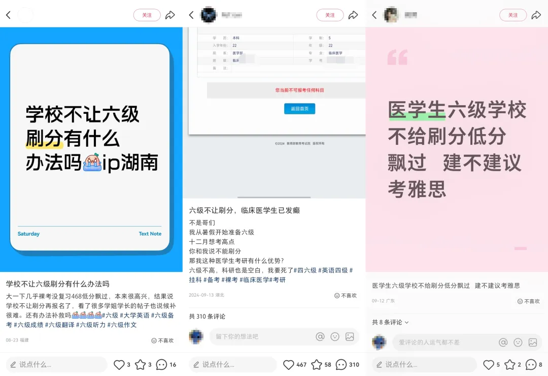升学就业等一系列隐形门槛驱动着学生加入刷分行列。在社交平台上,常有同学忐忑询问保研“六级成绩480+、500+是否够用”,但事实上,六级低分上岸的案例并不少见。在许多企业招聘中,对英语四六级也并没有高分要求,反而更关注口语、职场英语等英语实际应用的能力。