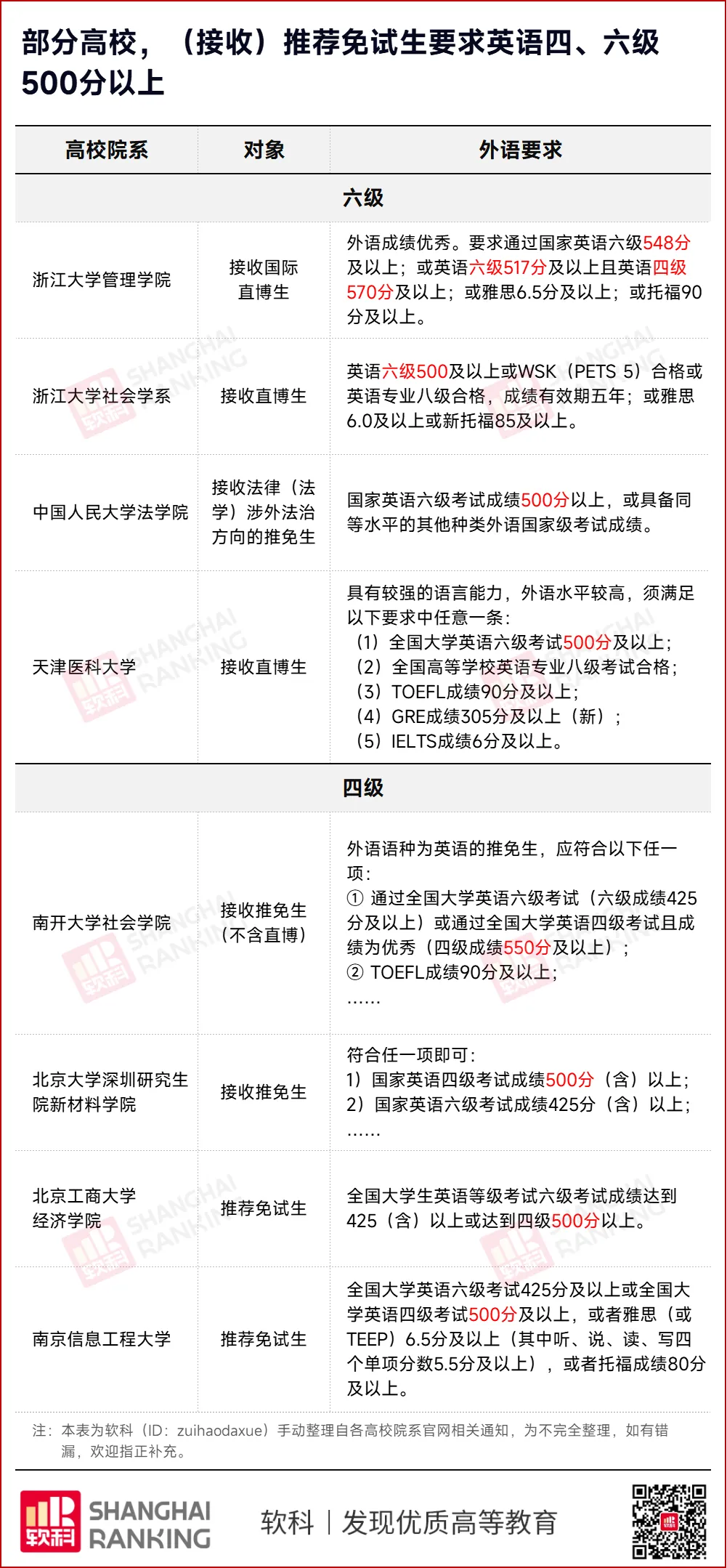 在竞争更激烈的保研中,有高校在同等条件下优先推荐大学英语六级考试500分(含)/托福80分(含)/雅思6分(含)以上的学生。也有同学反馈,在保研夏令营中,部分高校存在450分、500分等隐形门槛,500分被保研学生称为夏令营和预推免的“敲门砖”。不过,对英语六级的高分硬性要求其实更常见于有涉外性质的培养项目或直博生项目,比如浙江大学管理学院的国际直博生项目,中国人民大学法学院的法律(法学)国际仲裁方向和法律(法学)国际商事争端预防和解决方向推免项目。